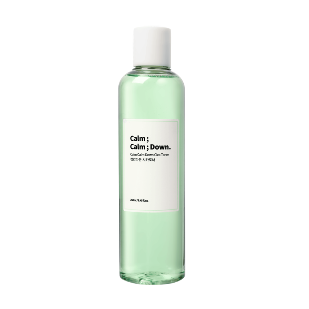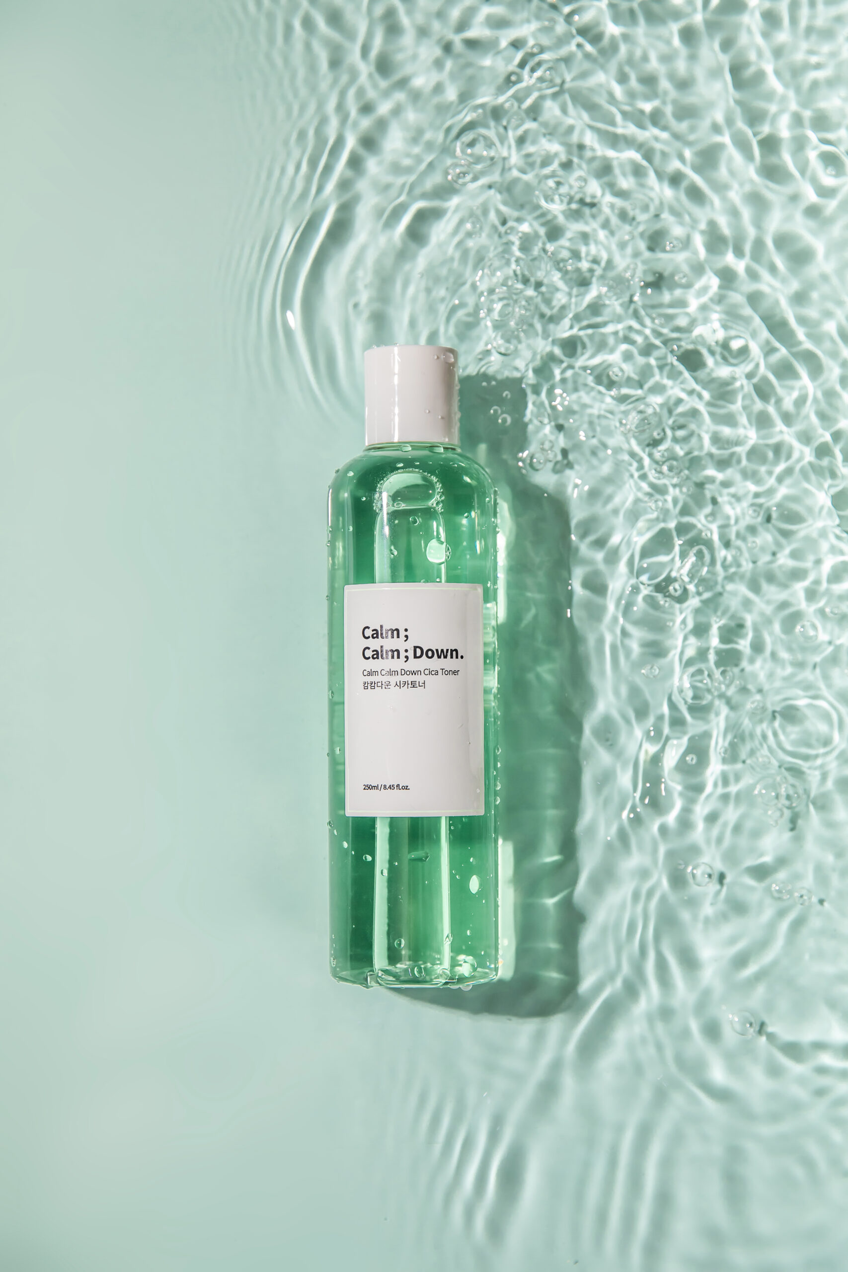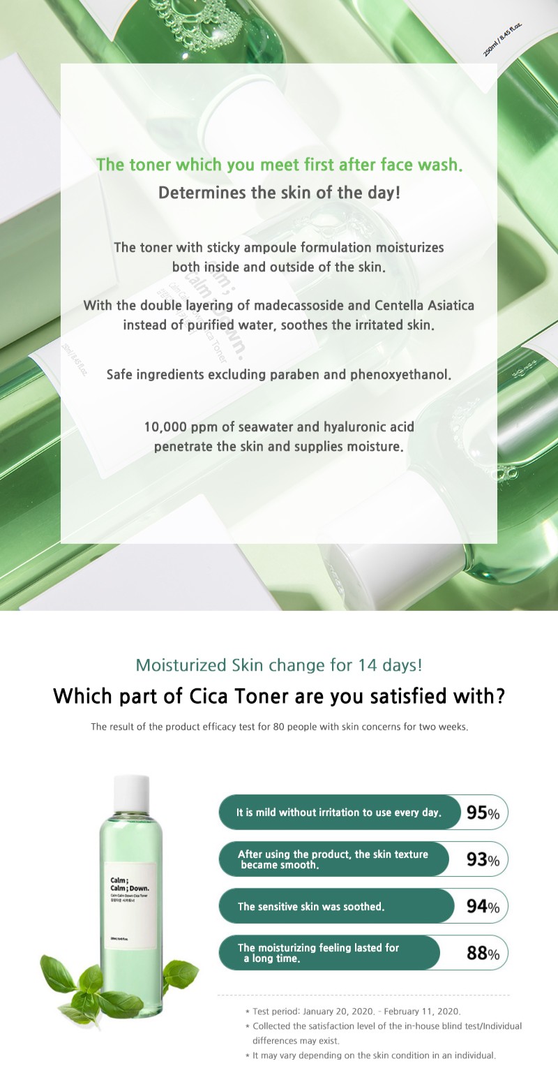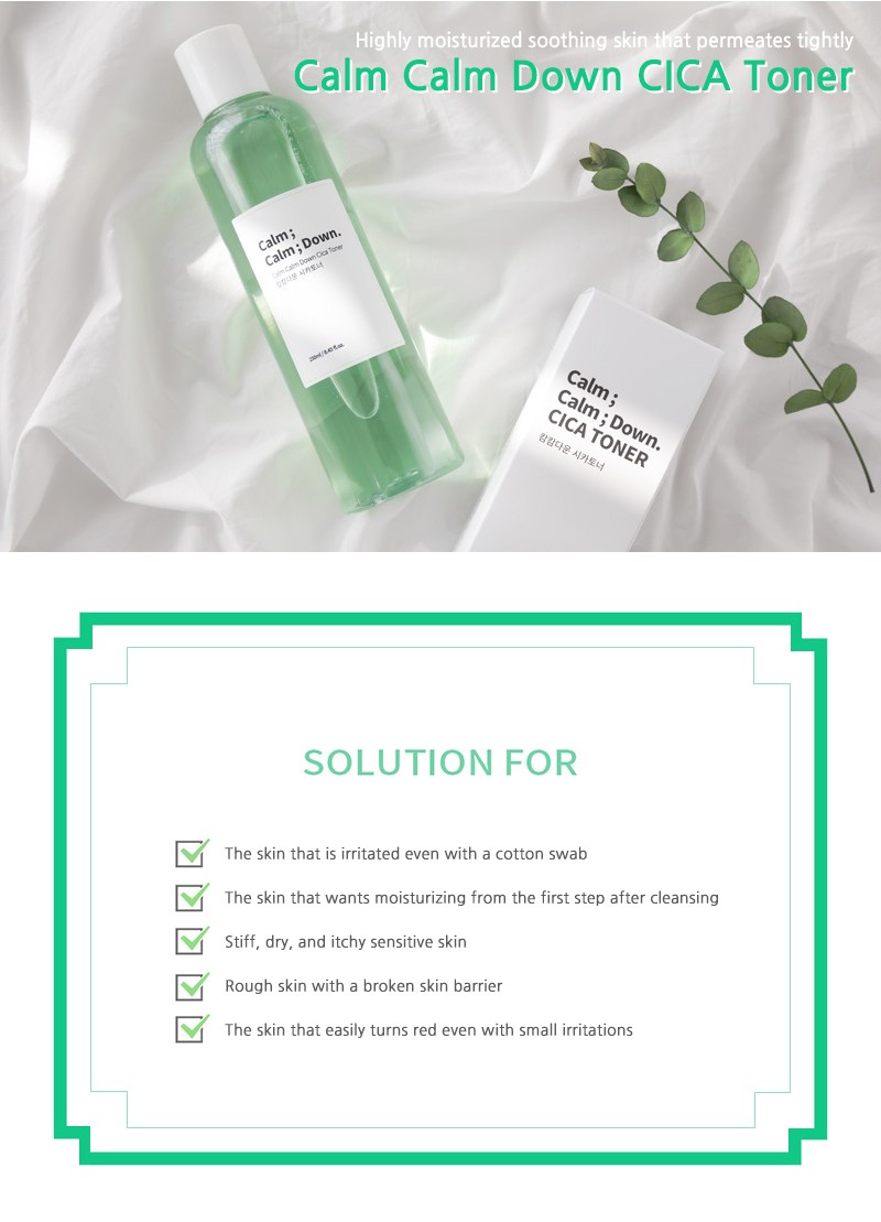 Calm; Calm; Down Cica Ampoule Toner combines soothing Centella Asiatica (Cica) extract with hydrating hyaluronic acid to calm irritation and deeply moisturize sensitive skin. Highly effective for strengthening the skin barrier and promoting a clear, balanced complexion. The ampoule-like lightweight texture provides all-in-one care without the need for additional skincare steps, absorbing quickly without stickiness.