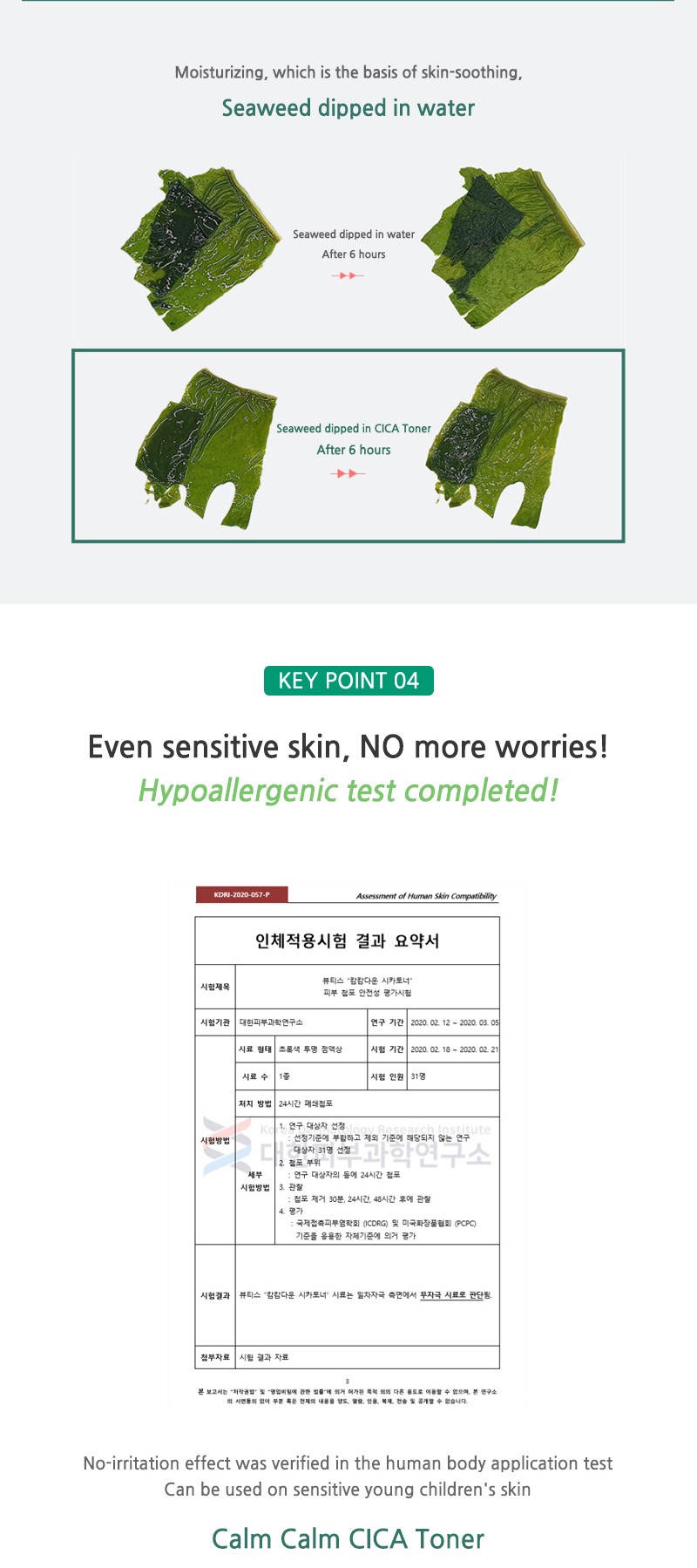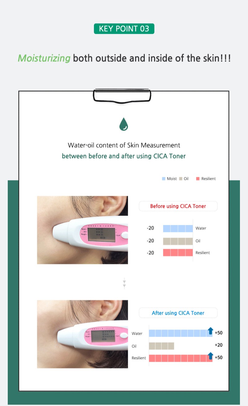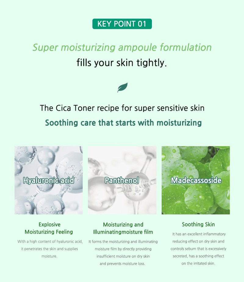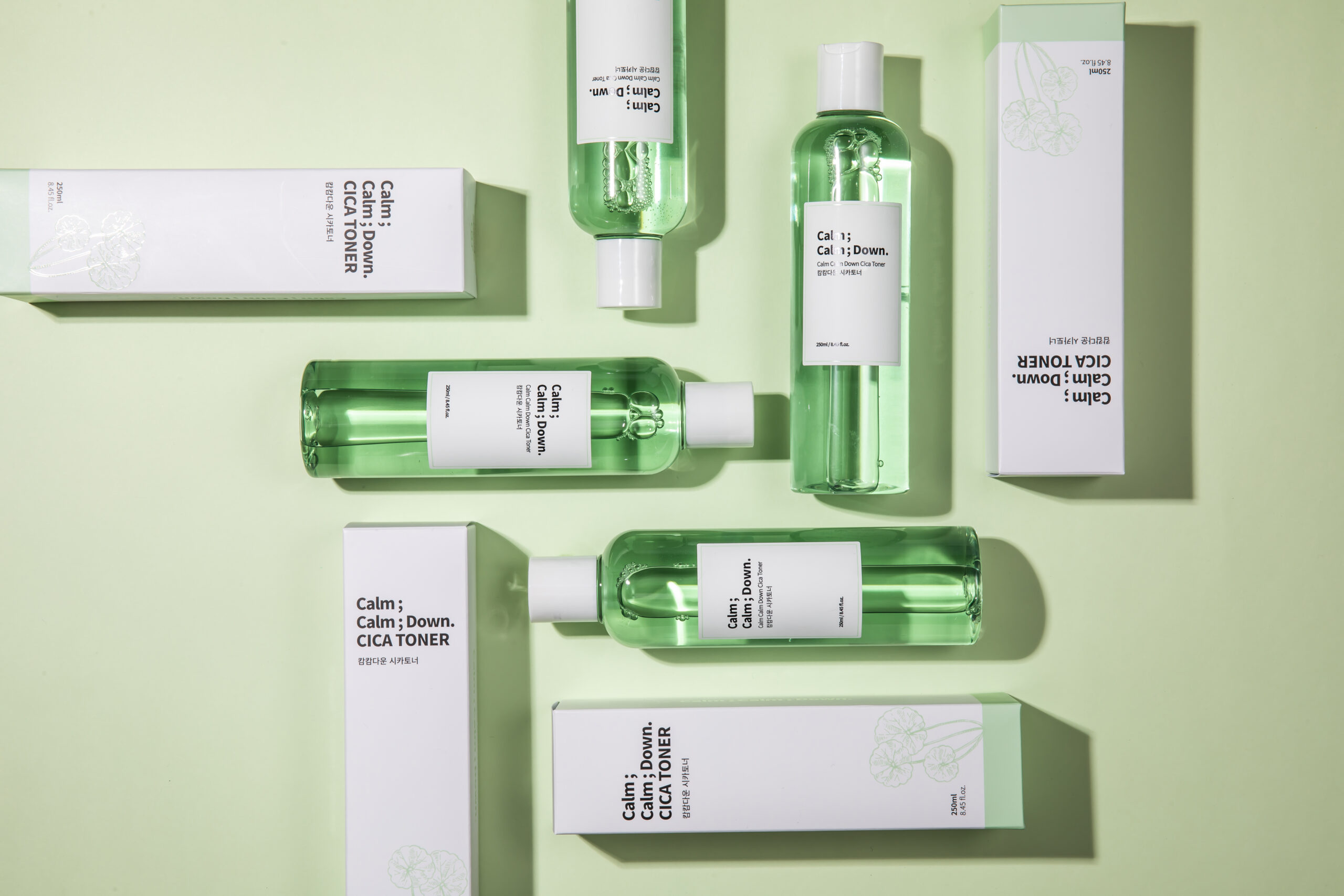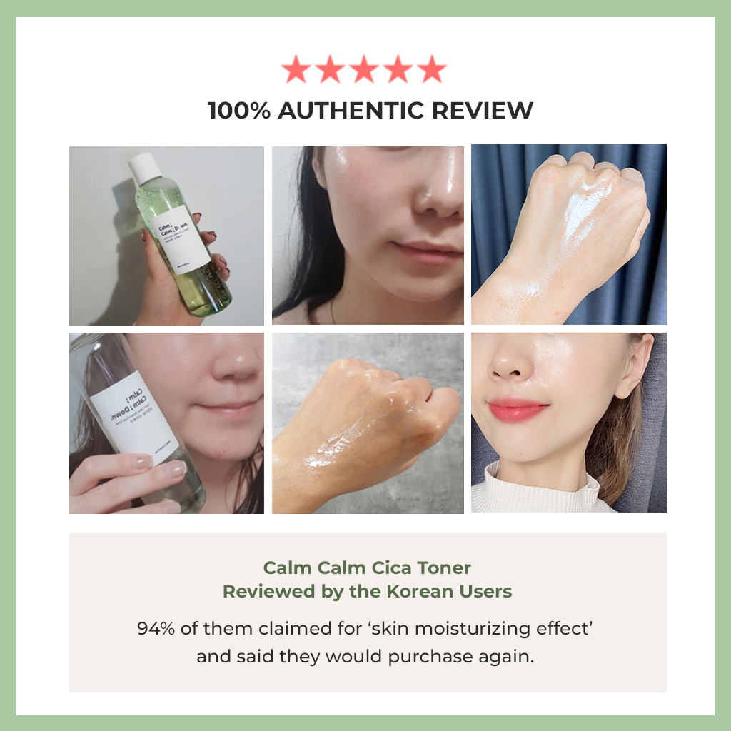 Calm; Calm; Down Cica Ampoule Toner combines soothing Centella Asiatica (Cica) extract with hydrating hyaluronic acid to calm irritation and deeply moisturize sensitive skin. Highly effective for strengthening the skin barrier and promoting a clear, balanced complexion. The ampoule-like lightweight texture provides all-in-one care without the need for additional skincare steps, absorbing quickly without stickiness.